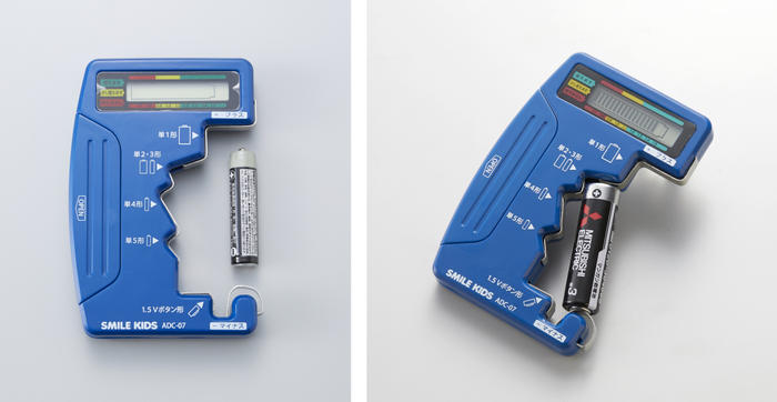 ・この電池チェッカーは、測定する電池から電池に応じた電流を消費しながら測定しますので、電池本来の残量測定ができ、電池に使用する機器が適切に判断できます。