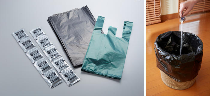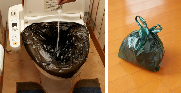 便座に汚物袋をかぶせて用を足し、上から凝固剤をふりかけて尿を固めて汚物袋の口を縛り、さらに処理袋で2重に縛り、各自治体の指示に従い廃棄します。 -