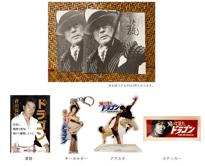 - 撮り下ろしフォトブックに、「帰って来たドラゴン」公式記録アクリルスタンド、アクリルキーホルダー、ステッカーを組み合わせた特別セットです。 記録と記念の両方を手元に残せる、支援者限定のリターンです。