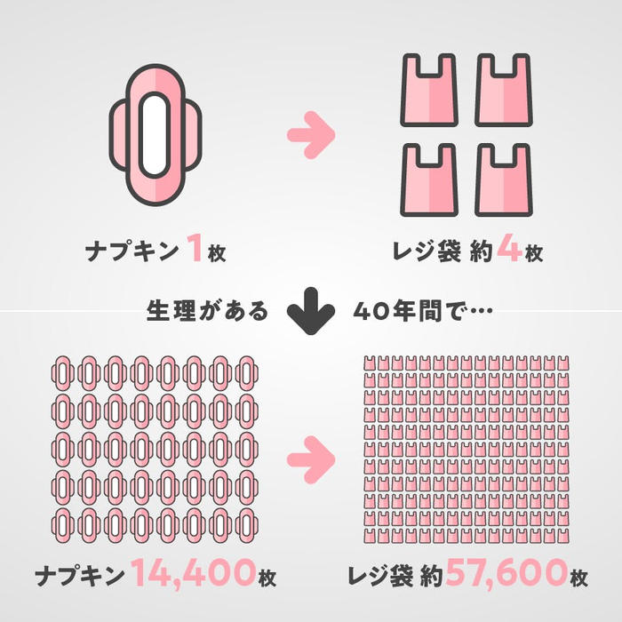 月に1回(平均6日間)、1日5枚使用すると仮定すると、生涯で使用するナプキンは 約14,400枚 にのぼります。さらに、使い捨てナプキン1枚に含まれるプラスチック量はレジ袋およそ4枚分とも言われています。つまり、ひとりの女性が一生のうちに消費するプラスチックは約57,600枚分のレジ袋に相当する計算になります。