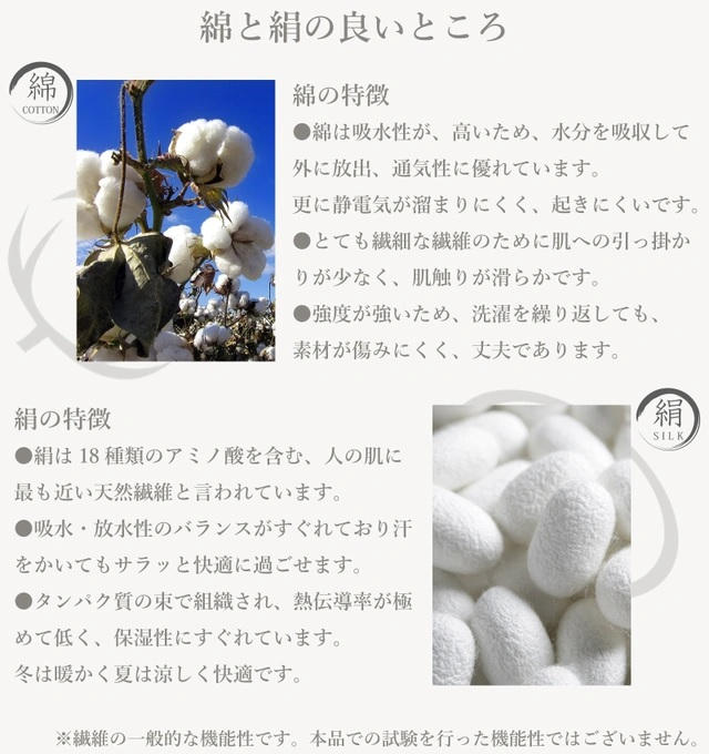 - 生地は、吸水性・通気性に優れ、肌触りが滑らかな綿と、人の肌に最も近い天然繊維で保湿に優れる絹を合わせた双方の良いとこどりを実現。春夏は涼しく快適に、秋冬はあたたかくご利用いただけます。