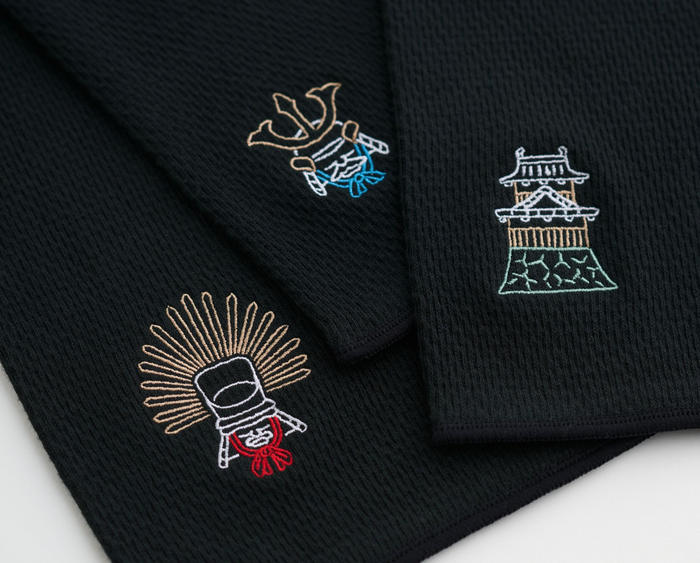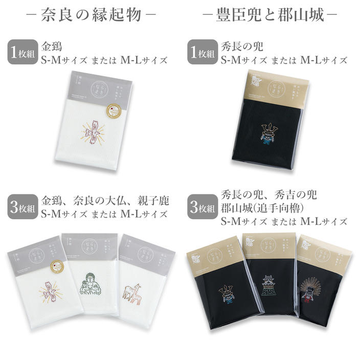 豊臣兜と郡山城のシリーズの1枚は『秀長の兜』、3枚セットには『秀長の兜』『秀吉の兜』『郡山城』の刺繍を各1枚ずつにてご用意しました。