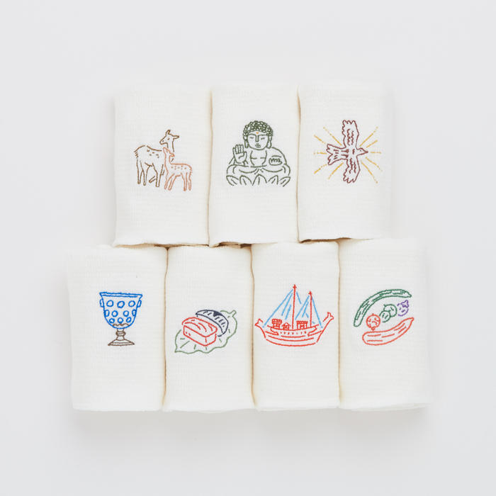 - 奈良の縁起物のシリーズの1枚は『金鵄』、3枚セットには『奈良の大仏』『親子鹿』『金鵄』の刺繍を各1枚ずつにてご用意しました。