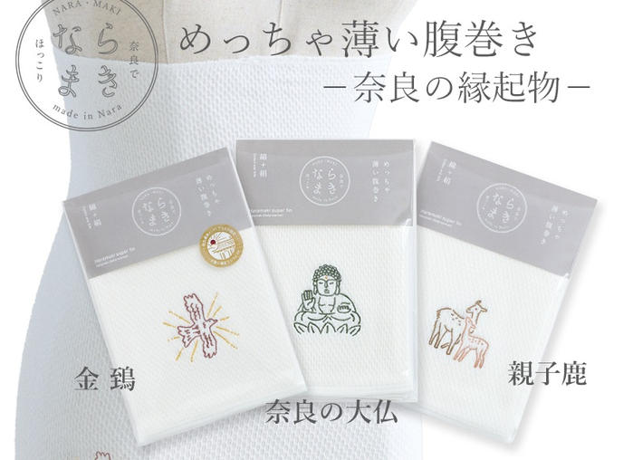 - 『ならまき』とは“ココロもカラダも奈良でほっこり”をコンセプトにした奈良の腹巻きブランドです。その主力アイテムなのが、『めっちゃ薄い腹巻き』。