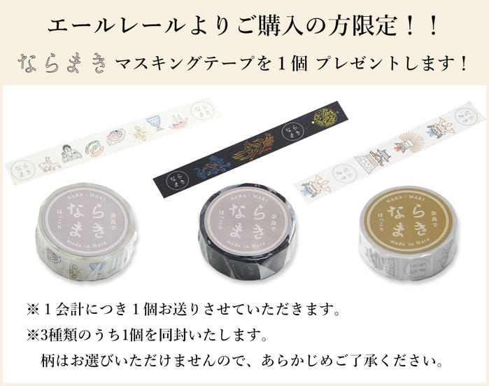 - このエールレールの販売ページからご購入いただいたお客様には『ならまき マスキングテープ』を1個プレゼント致します。柄が3種類ございますがお選びいただけませんのであらかじめご了承ください。商品に同梱致しますので、この機会にご利用の程、よろしくお願い致します。