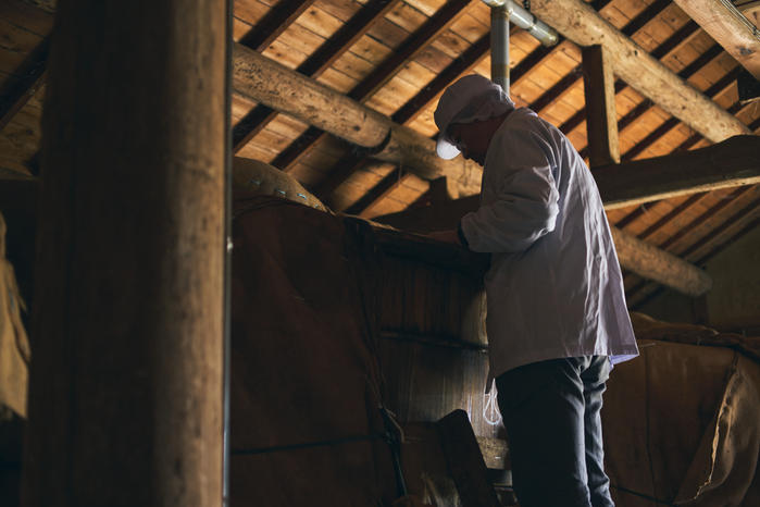 私たちの酢づくりも、酒づくりから始まります。できた酒を木桶にうつし、3ヶ月以上かけて酢酸発酵させることでお酢ができます。そうして、時間をかけ、職人の技術により木桶で仕込まれた酢は、まろやかな味わいで、その蔵ならではの味ができあがります。 -